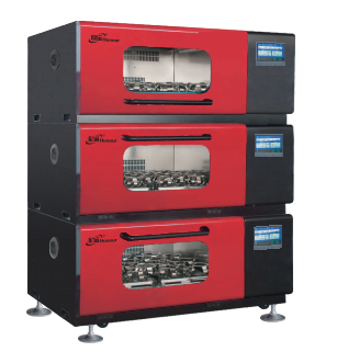 ※下兩層為下翻式開門,第三層為上翻式開門,搖板可自由抽出,方便裝卸搖瓶,每層可獨立控制,各層可在不同溫度轉速下同時運轉或根據需要運轉任意一層。